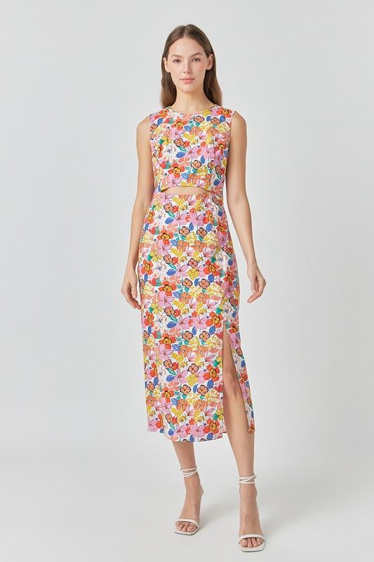 The perfect dress to make a statement! This gorgeous floral print maxi dress features a round neckline, waist cut-out detail, & a back neck bow tie.